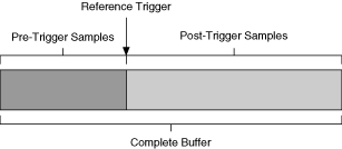 When the acquisition begins, the DAQ device writes samples to the buffer. After the DAQ device captures the specified number of pretrigger samples, the DAQ device begins to look for the reference trigger condition. If the reference trigger condition occurs before the DAQ device captures the specified number of pretrigger samples, the DAQ device ignores the condition.