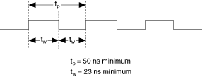 The maximum allowed frequency is 20 MHz, with a minimum pulse width of 10 ns high or low. There is no minimum frequency.
