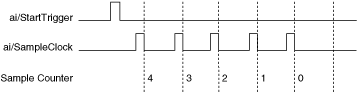 An acquisition with posttrigger data allows you to view data that is acquired after a trigger event is received. A typical posttrigger DAQ sequence is shown in the following figure. The sample counter is loaded with the specified number of posttrigger samples, in this example, five. The value decrements with each pulse on ai/SampleClock, until the value reaches zero and all desired samples have been acquired.