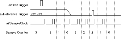 If an ai/ReferenceTrigger pulse occurs before the specified number of pretrigger samples are acquired, the trigger pulse is ignored. Otherwise, when the ai/ReferenceTrigger pulse occurs, the sample counter value decrements until the specified number of posttrigger samples have been acquired. For more information about start and reference triggers, refer to Analog Input Triggering.