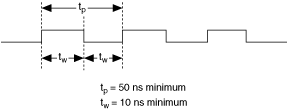 The maximum allowed frequency is 20 MHz, with a minimum pulse width of 10 ns high or low. There is no minimum frequency.
