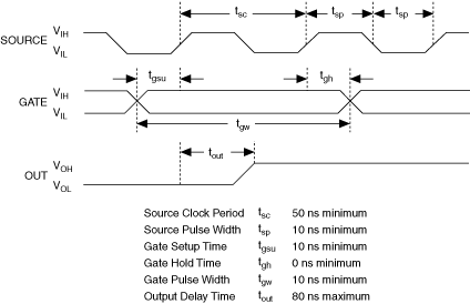 The following figure shows the timing requirements for the gate and source input signals and the timing specifications for the output signals on your device.