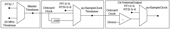 There is one AO Sample Clock that causes all AO channels to update simultaneously. The following figure summarizes the timing and routing options provided by the analog output timing engine.